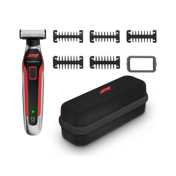 En el partido de la vida, no hay tiempo para hacer cambios en el equipo. Por eso el cortapelos para barba Formula 1® de Rowenta presenta cuchillas 100 % de acero inoxidable con tecnología de autoafilado que no requieren sustitución. Este versátil barbero para hombre ofrece una triple función: corta, perfila y afeita barbas de cualquier longitud sin defraudar nunca. Además, puedes personalizar tu estilo cada día gracias a las cinco longitudes (1-2-3-5-6 mm) de sus peines. Su accesorio antiirritación permite un mejor deslizamiento durante el corte y reduce más el riesgo de irritabilidad, por lo que es perfecto para su uso tanto en la cara como en el cuerpo. Ofrece un corte rápido de una sola pasada y, gracias a su autonomía excepcional de hasta 120 minutos y a su función de carga rápida, siempre estarás tranquilo de poder contar con él. Además de moderno, ergonómico y compacto, este barbero para hombre es totalmente resistente al agua y cuenta con un agarre antideslizante, por lo que permite un fácil manejo incluso mojado y es ideal para usarlo en la ducha